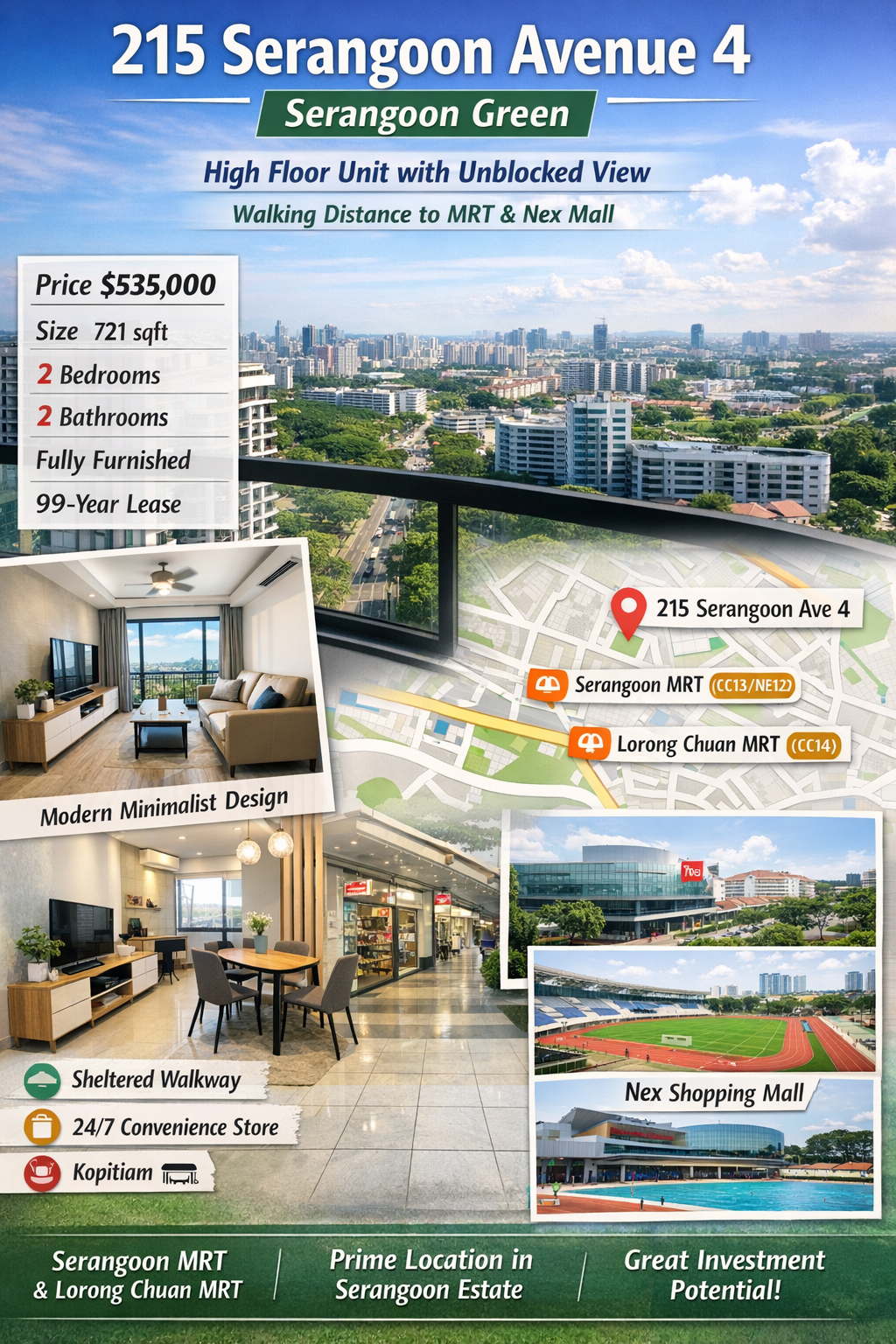 The unit located at 215 Serangoon Avenue 4 Serangoon Green presents a valuable opportunity for buyers seeking a well-positioned HDB property in Singapore. Priced at $535,000, this home offers a comfortable 721 sqft layout with a competitive $742.02 psf, making it an attractive option in the Serangoon property market. With its high floor unit, unblocked view, and minimalist design, this property combines practicality, comfort, and long-term value.