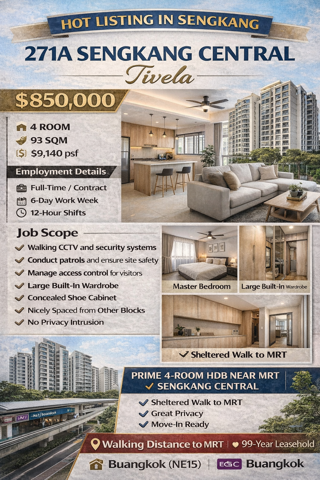 The property located at 271A Sengkang Central Tivela represents one of the most attractive residential opportunities in the Sengkang property market in Singapore. Priced at $850,000, this 4A HDB unit in Sengkang Central offers an ideal balance between modern living, accessibility, and long-term property value. For buyers searching for a Sengkang Central HDB near MRT, this unit stands out due to its strategic location, excellent layout, and move-in ready condition.