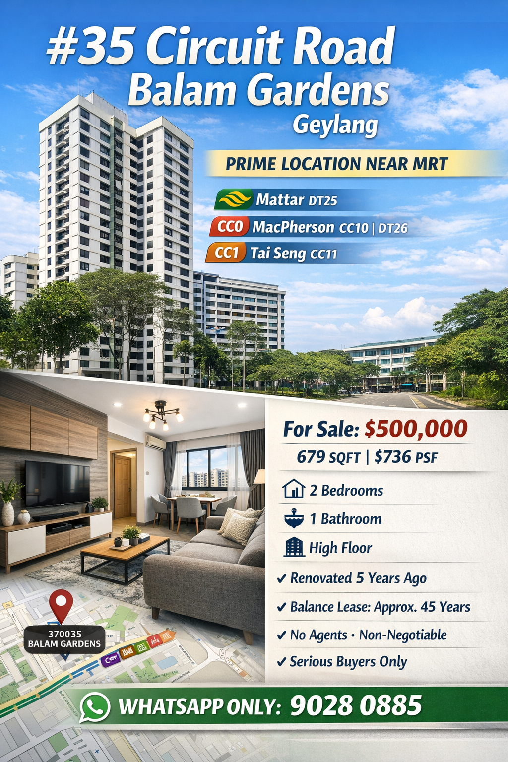 Singapore’s property market remains one of the most attractive in the world due to its strategic location, strong infrastructure, and stable real estate value. One standout listing is 35 Circuit Road Balam Gardens, offered at $500,000, with a size of 679 sqft and a competitive price of $736.38 psf.