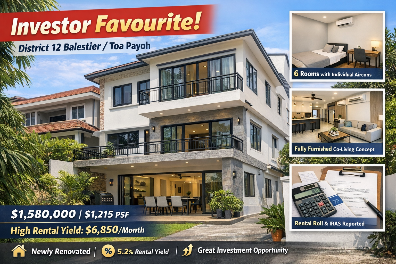 Priced at S$1,580,000 or approximately S$1,215 per square foot, this property is widely regarded as an investor favourite, particularly due to its innovative co-living concept, strong rental track record, and excellent proximity to key MRT stations such as Boon Keng, Novena, and Toa Payoh. With six bedrooms, six individual air-conditioning units, modern fittings, and verified rental roll reported to IRAS, this property represents a turnkey investment opportunity in one of Singapore’s most resilient real estate segments.