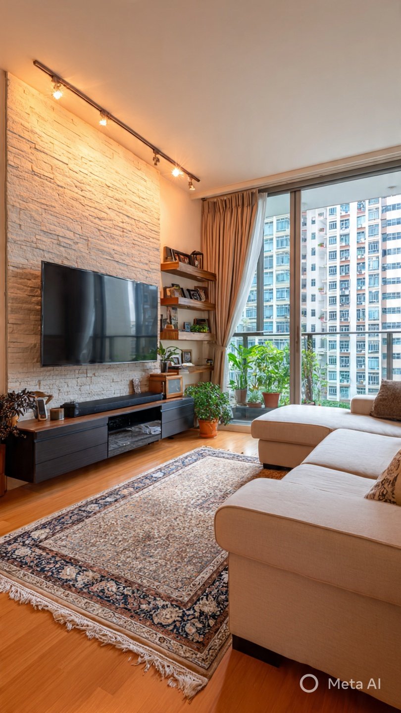 The oversized living room serves as the heart of the home, ideal for family gatherings, celebrations, or simply relaxing together after a long day. With ample room for a large sofa set, dining area, and entertainment setup, the living space reflects the true meaning of a Jumbo HDB apartment in Singapore.
