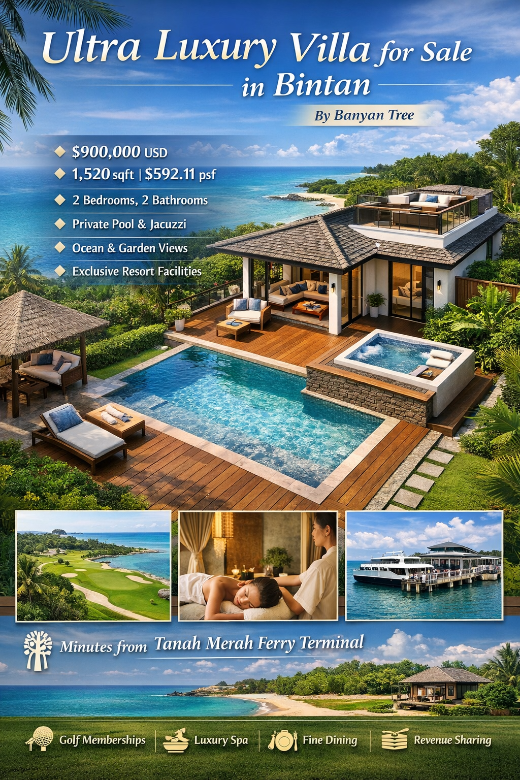 Discover a rare opportunity to own an ultra luxury villa in Bintan developed by the internationally renowned Banyan Tree. Priced at $900,000 with a generous size of 1,520 sqft (only $592.11 psf), this property offers a perfect balance between luxury living, smart investment, and resort-style lifestyle.